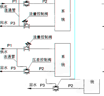 現(xiàn)以安裝在回水管道上的ZYC型自力式壓差控制閥為例說明工作原理。當(dāng)供水壓力p1增大或減小時(shí),信號(hào)由連接管傳如膜片上腔,帶動(dòng)閥芯下移,使閥座的流通面積減小或增大。P2-P3也增大或減小,直到P1-P2保持原值恒定。當(dāng)回水壓力P3增大或減小的瞬間同閥座流向出口的流速降低或升高,膜片下壓力P2也在這個(gè)瞬間增高或降低,帶動(dòng)閥芯上移或下移,知道膜片的受力重新平衡,P2恢復(fù)原值,P1-P2保護(hù)原值恒定,從而保證了被控系統(tǒng)的供回水間壓差基本不變。